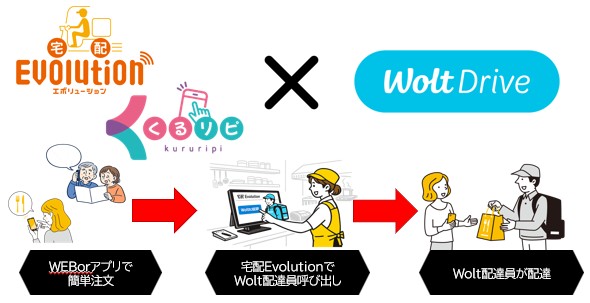 宅配Evolutionの「Wolt Drive連携機能」では、電話・WEBで受注した自社デリバリー注文を、自社配達員で対応できない場合にボタン一つでWolt配達員へ依頼できます。